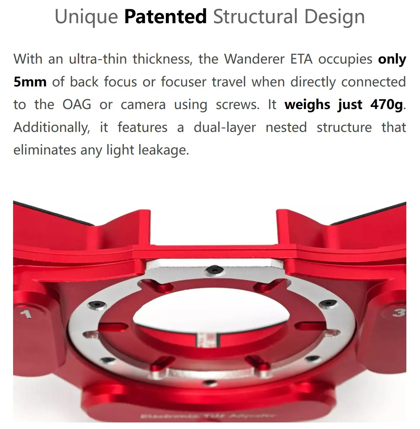 The Wanderer ETA can be directly mounted in front of an OAG or camera using screws and, in most cases, still maintain a 55mm back focus. For detailed installation instructions and device compatibility, please refer to the user manual.