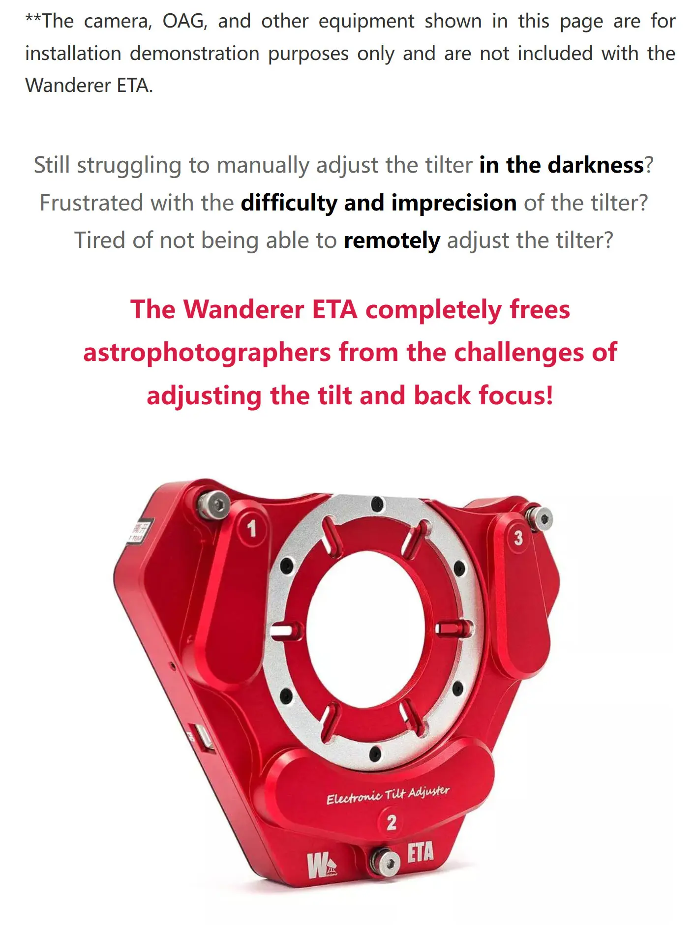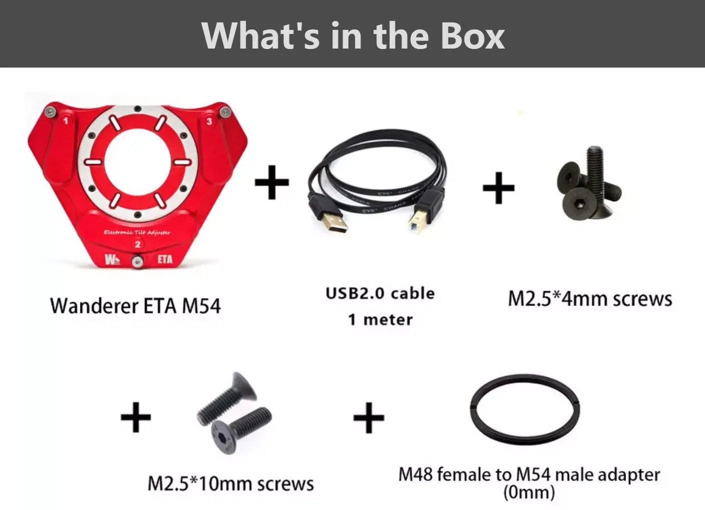 The Wanderer ETA can also be connected to OAG/filter wheel/camera with M54 threads, you need to purchase our Camera Side M54 Female Adapter for Wanderer Electronic Tilt Adjuster M54 (WETA54-M54F.Sold separately)