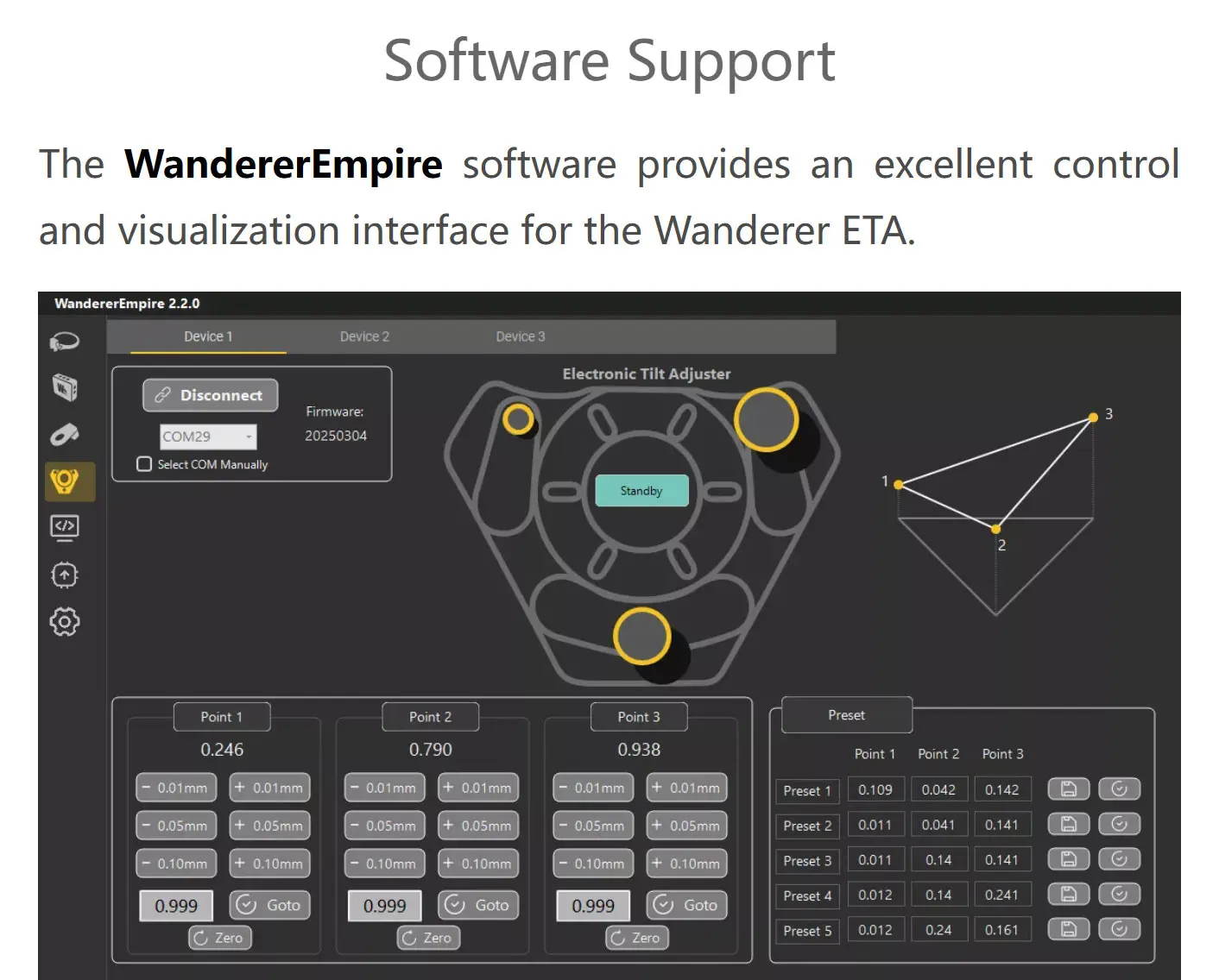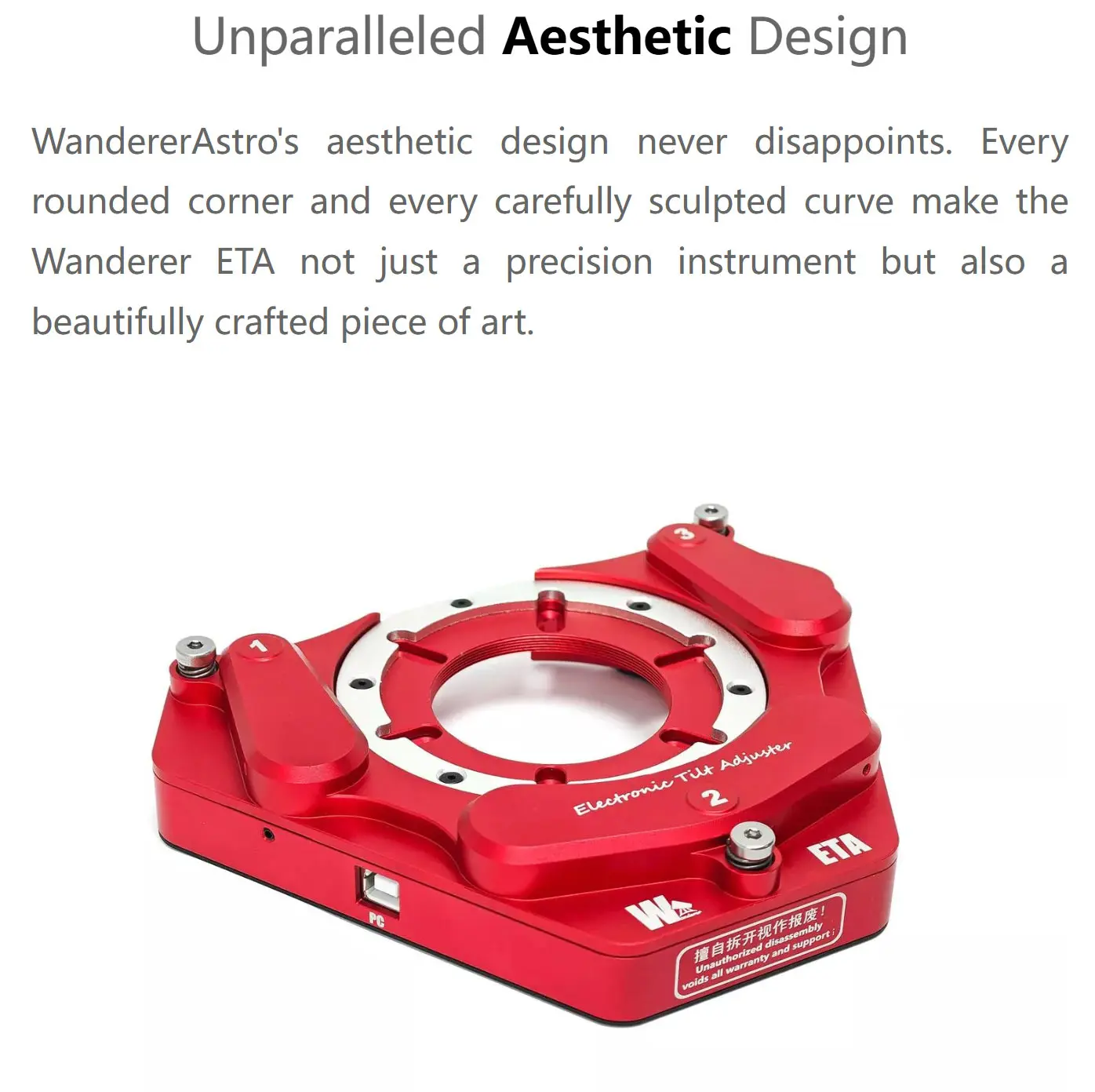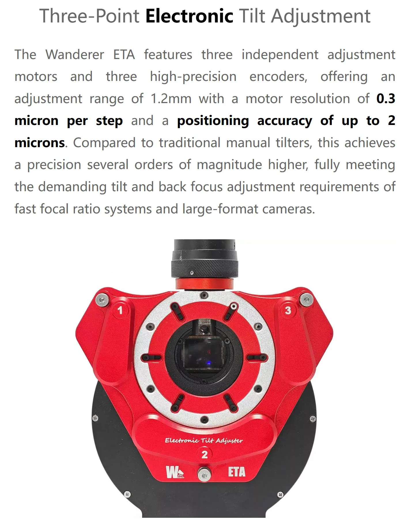 The Wanderer ETA features three independent adjustment motors and three high-precision encoders, offering an adjustment range of 1.2mm with a motor resolution of 0.3 micron per step and a positioning accuracy of up to 2 microns. Compared to traditional manual tilters, this achieves a precision several orders of magnitude higher, fully meeting the demanding tilt and back focus adjustment requirements of fast focal ratio systems and large-format cameras.