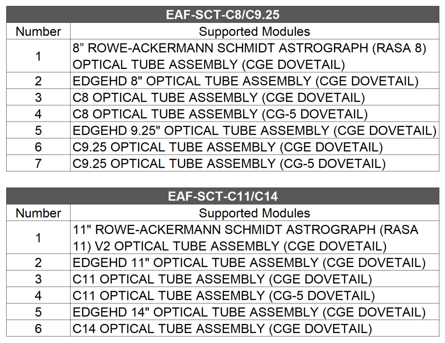 * The current 5mm flexible coupling is compatible with the older version of the EAF when used with Takahashi, C8, and C11 telescopes. However, it is not fully compatible with the new EAF and EAF Pro and is not recommended for use with them.