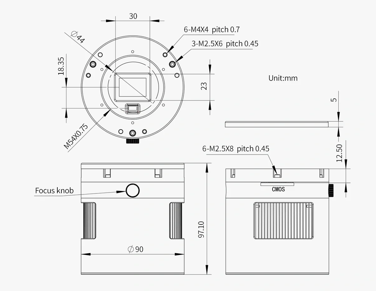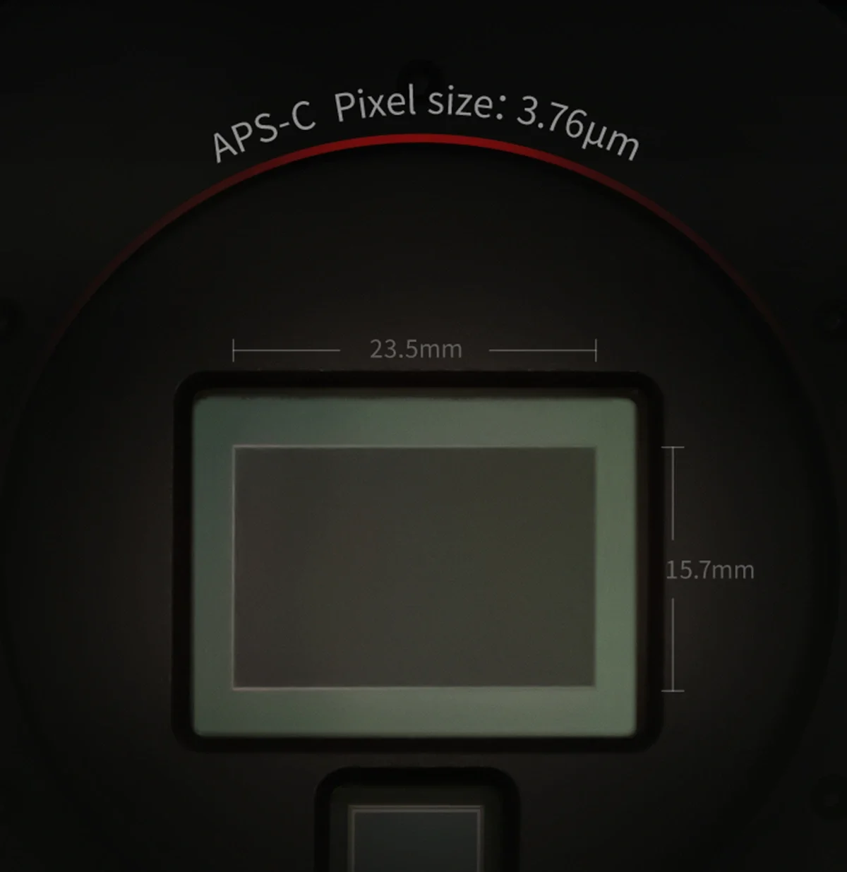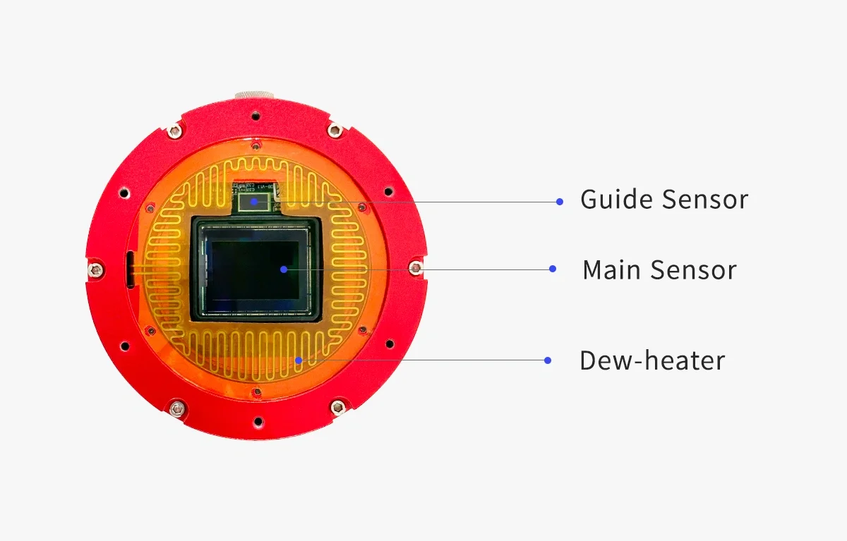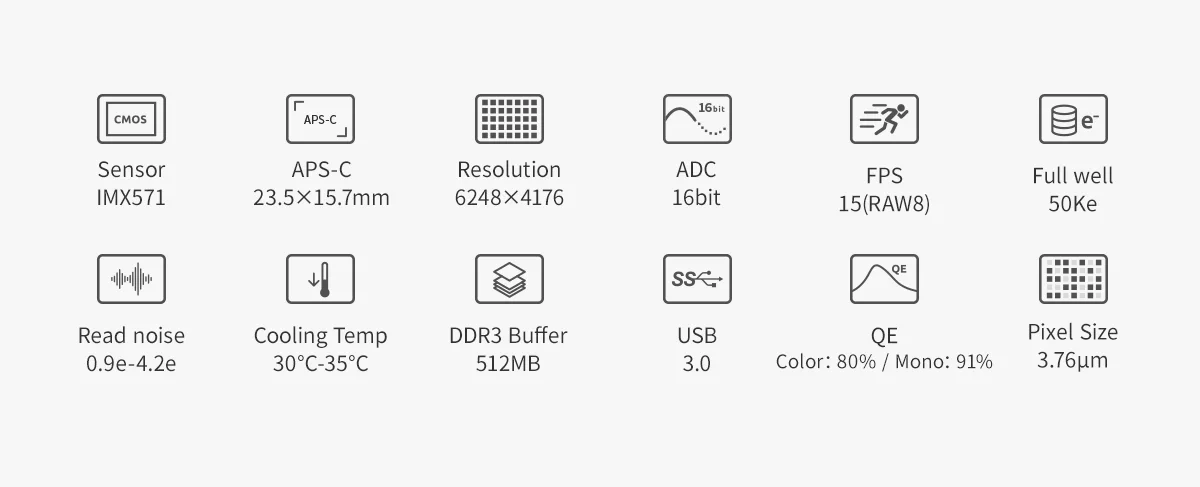 The main sensor IMX571 features an APS-C format and 26MP total pixels. The size is 23.5mm in width x 15.7mm in height, and the diagonal is 28.3mm. The 3.76um x 3.76um small pixel size accommodates an impressive full depth of 50ke. With the new hardware technology, it is even extended to 73ke.