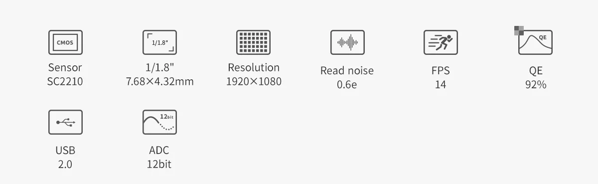 The SC2210 sensor taken from the ASI220MM Mini camera features very high sensitivity. The QE peak value reaches 92% at 500nm. The readout noise is as low as 0.6e. As the new generation of guide sensor, it has achieved great results in guiding, proved by hundreds of astrophotographers.