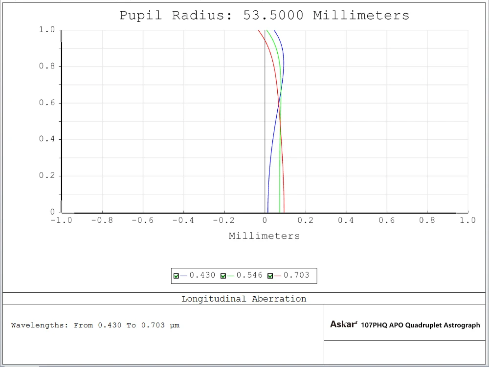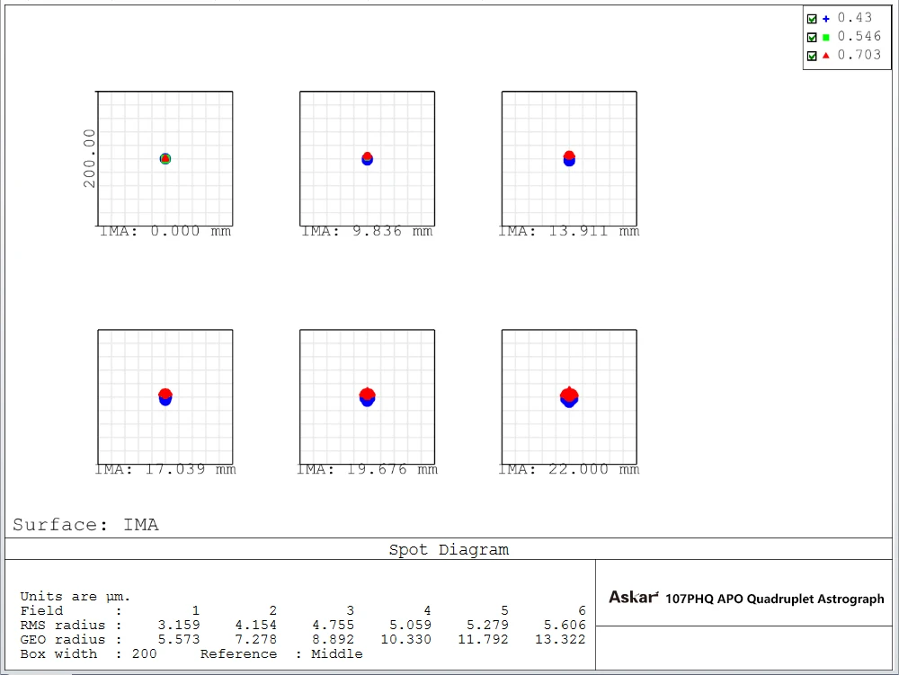 The built-in Flatfield lens is a great contribution to Askar 107PHQ’s imaging ability. It supports 44mm full-frame imaging. The stars around the corner of the images seldom suffer from distortion or deformation. At the center of its field of view, the RMS radius is merely 3um. Even a fastidious user can also be satiated when it comes to the shape of stars. Askar 170PHQ can effectively handle with problems of field curvature and vignette.