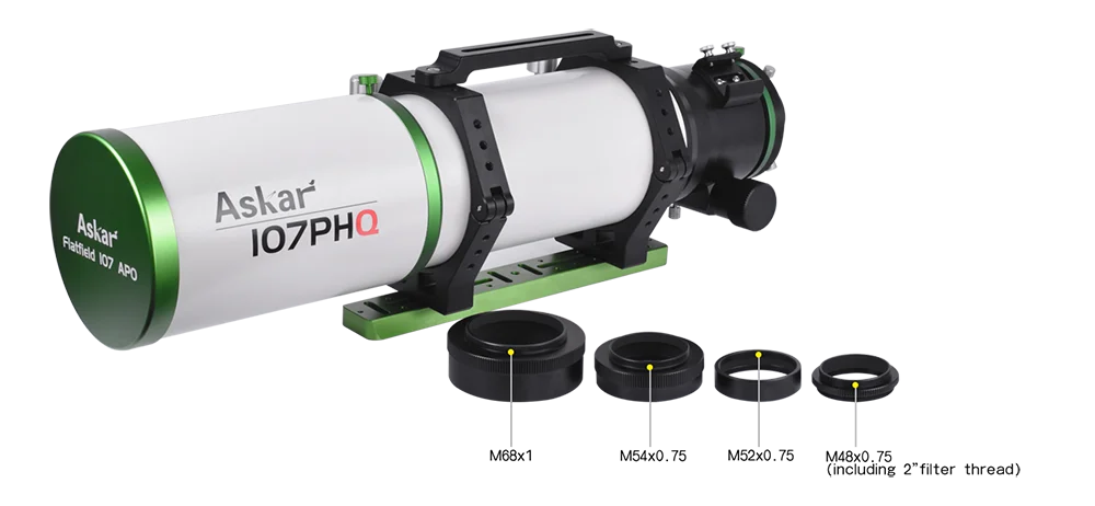 The standard package includes an Askar 107PHQ OTA, a set of four-piece M86-M48 adapters, a pair of tube rings, a 300mm Askar Vixen-style dovetail plate and a high-quality aluminum suitcase.