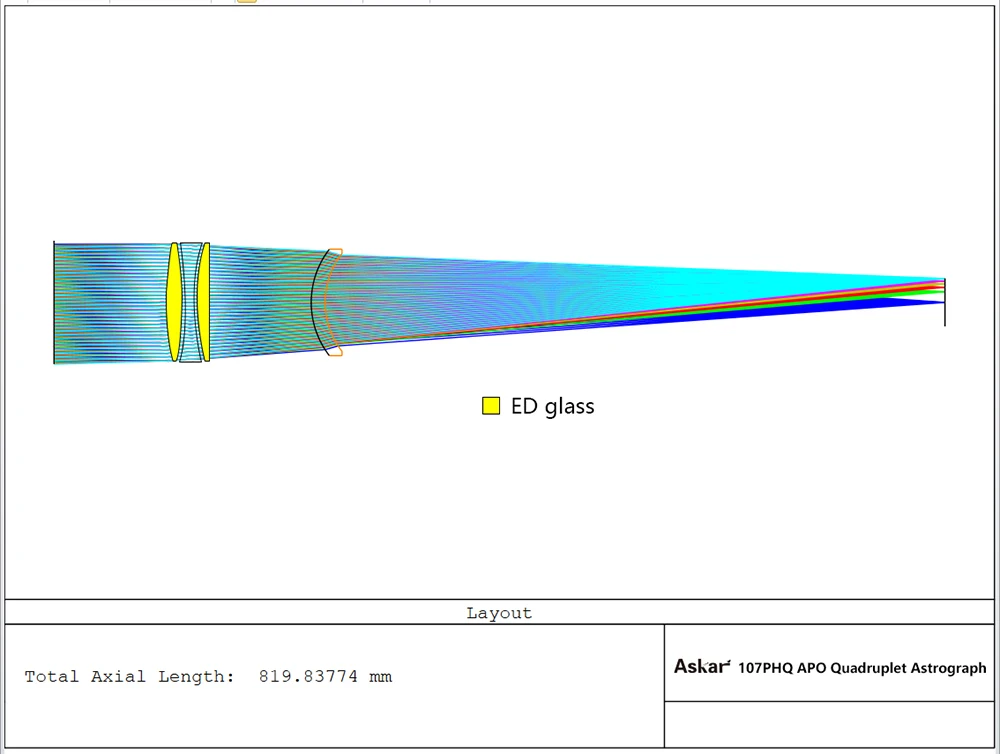 Askar 107PHQ, an f/7 astrograph, contains four pieces of lenses including two pieces of ED glass, which can better reduce chromatic aberration. It can achieve excellent color correction even with the magnification mounting to 300× in visual observation.