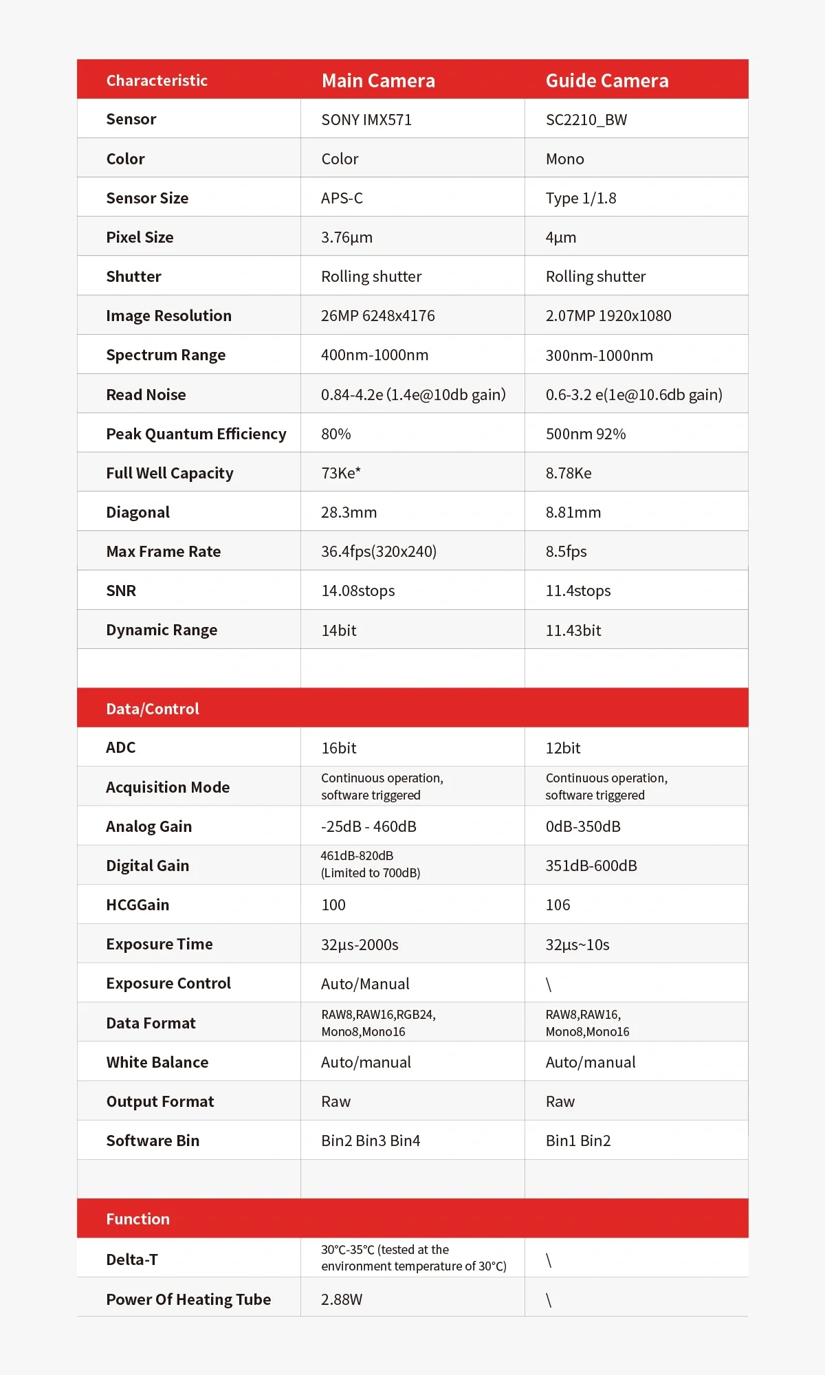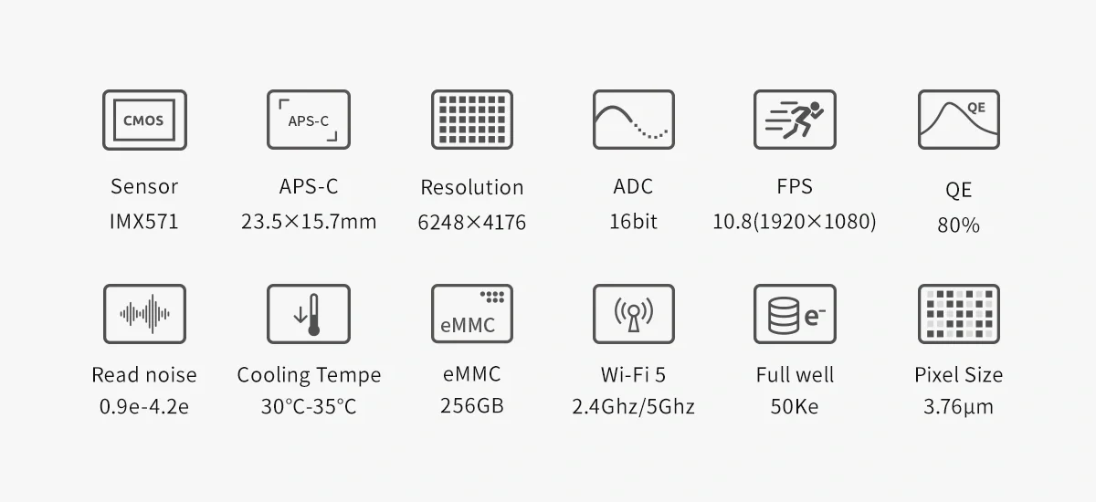 The main sensor IMX571 features an APS-C format and 26MP total pixels. The size is 23.5mm in width x 15.7mm in height, and the diagonal is 28.3mm. The 3.76um x 3.76um small pixel size accommodates an impressive full depth of 50ke. With the new hardware technology, it is even extended to 73ke.