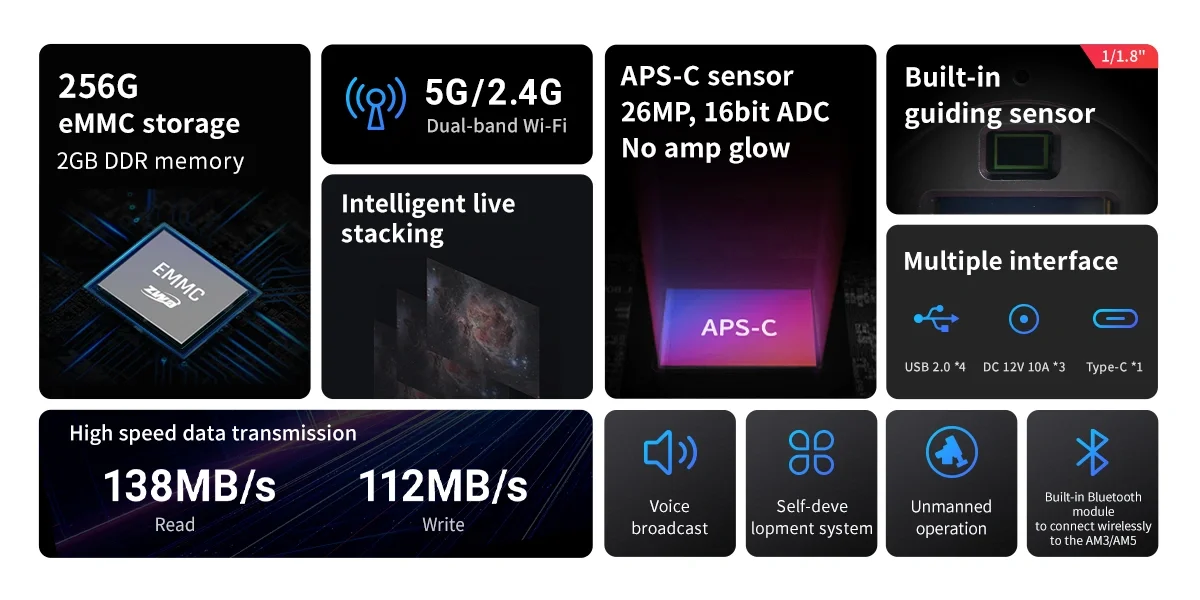 With the ASIAIR smart app, you can easily control guiding, imaging, your mount, and electronic focuser—all from your phone. It supports multiple imaging modes, making it easy for even beginners to quickly learn and capture professional-quality images.