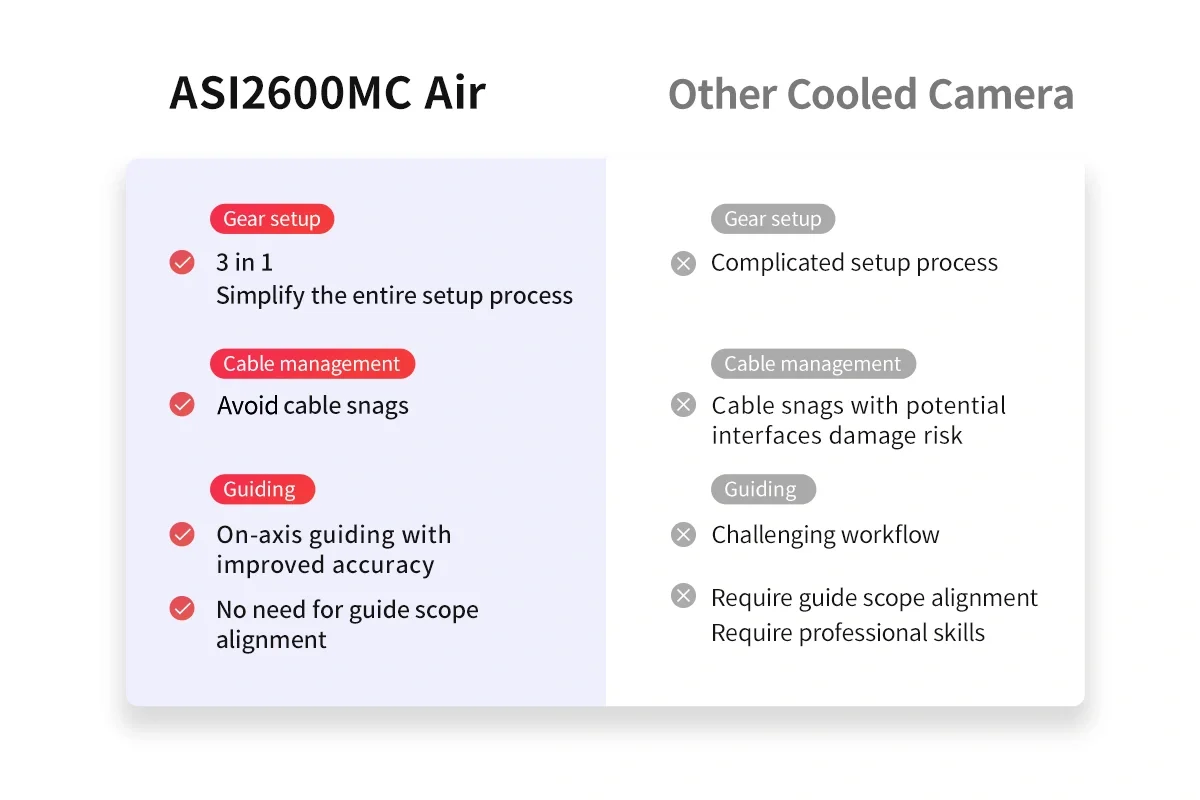 The ASI2600MC Air combines guiding, imaging, and smart control into one compact, lightweight device. Say goodbye to complex setups and enjoy a seamless, hassle-free astrophotography experience.
