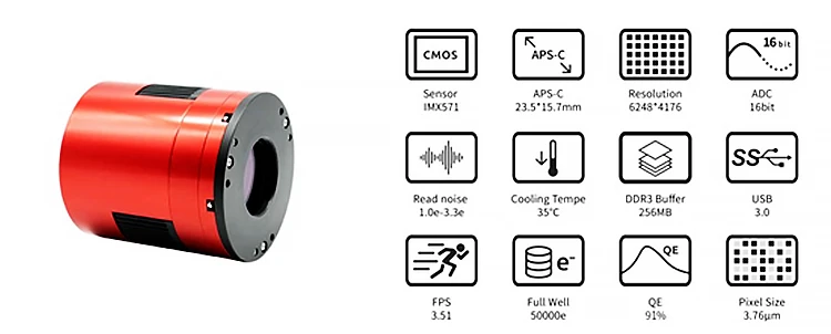 ASI2600MM Pro uses Sony's latest back-illuminated IMX571 sensor, APS-C format, and native 16bit ADC. Ultra-high dynamic range of 14 stops, ultra-low 1.0e readout noise, and innovative breakthrough with zero glow, it can be described as ZWO's new generation APS-C format flagship camera. It is a star camera born in response to the appeal of the majority of astrophotography enthusiasts.